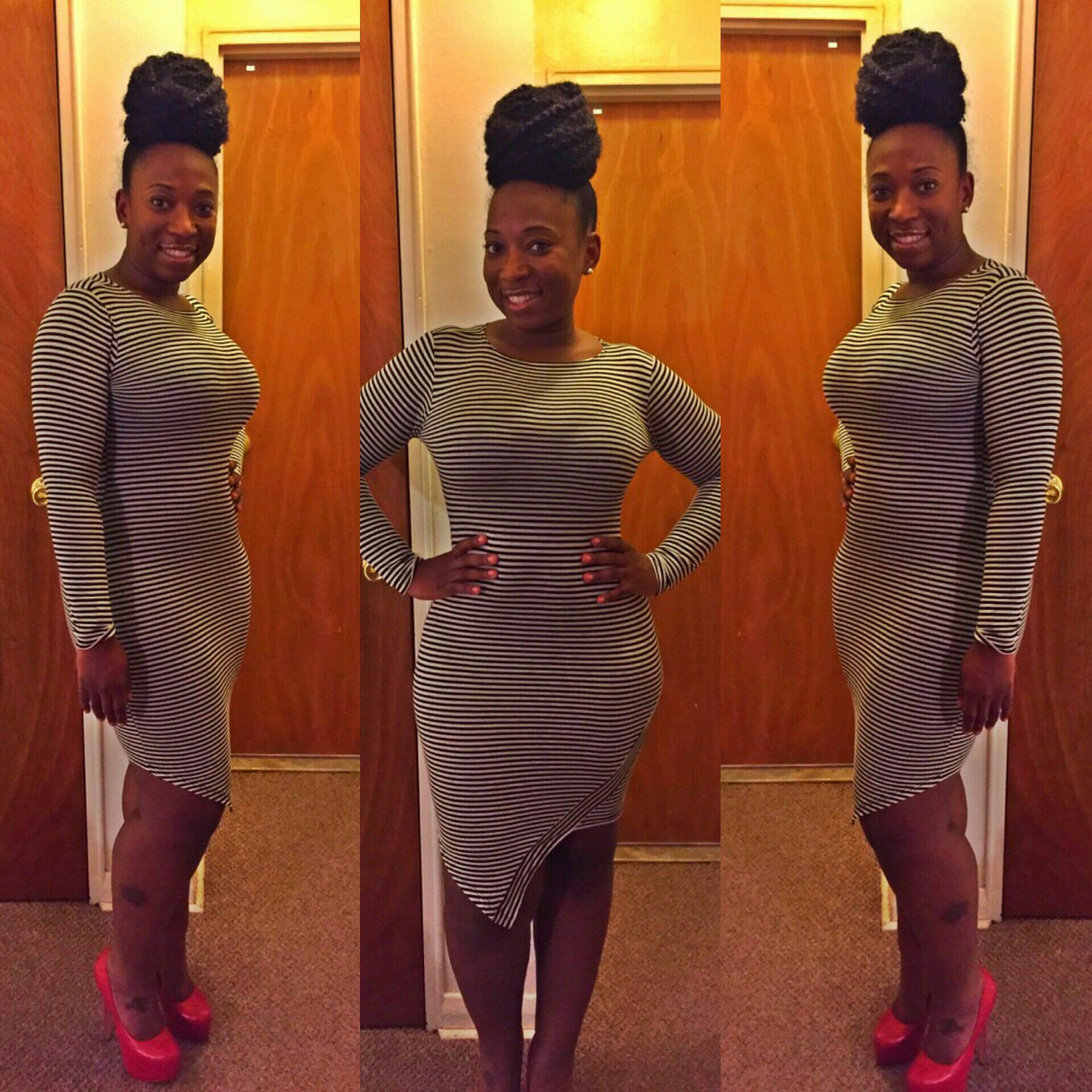 This dress features soft smooth striped stretch knit, round neckline, long sleeves, asymmetrical hem, with detailed stitching finish
