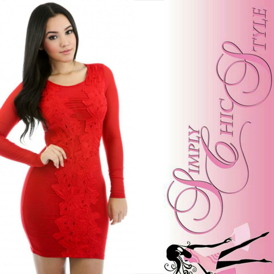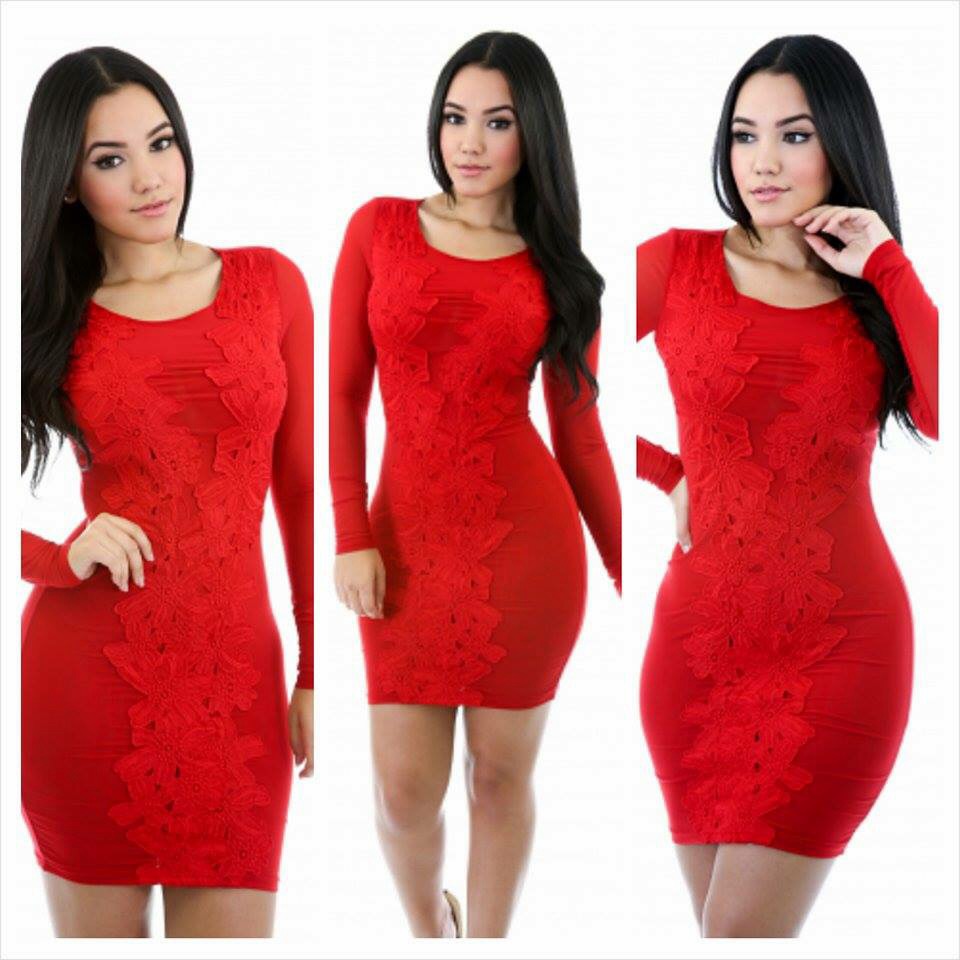 This dress features soft smooth stretchy fabric, round neckline, long sleeves, partial mesh, with crotchet knit flower design.