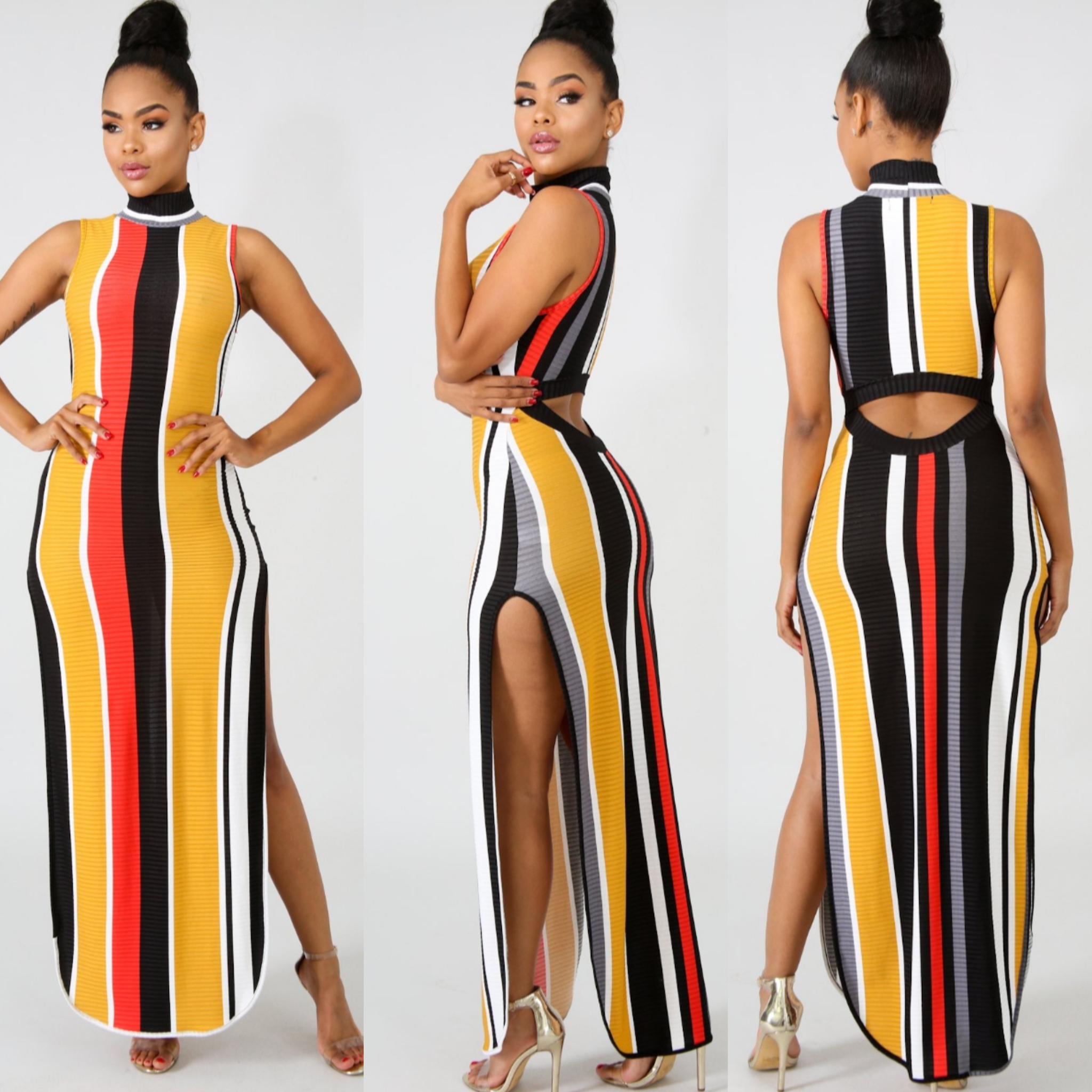 Long Maxi Dress featuring lightweight soft stretchy fabric, round neckline, side high splits on both sides no closures with open back detail. 95% Polyester 5% Spandex Model Wearing a Small