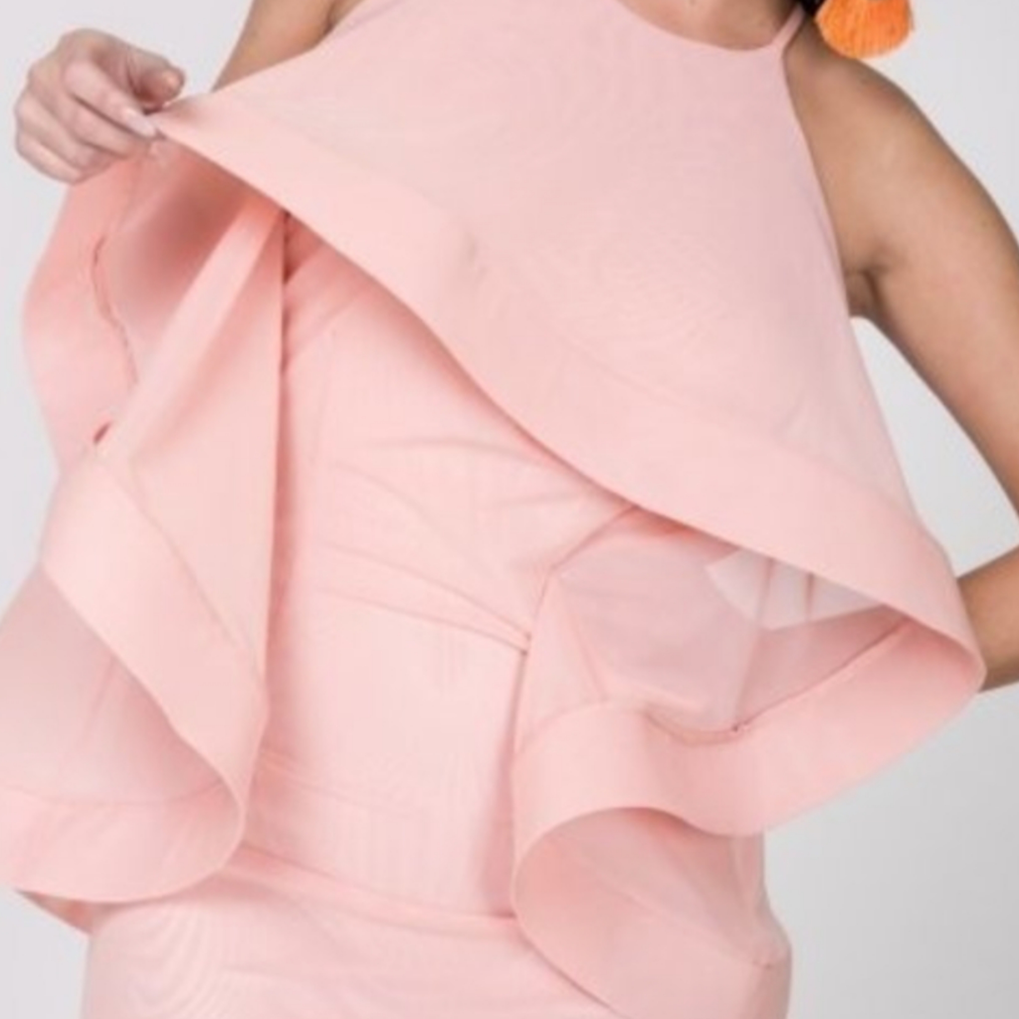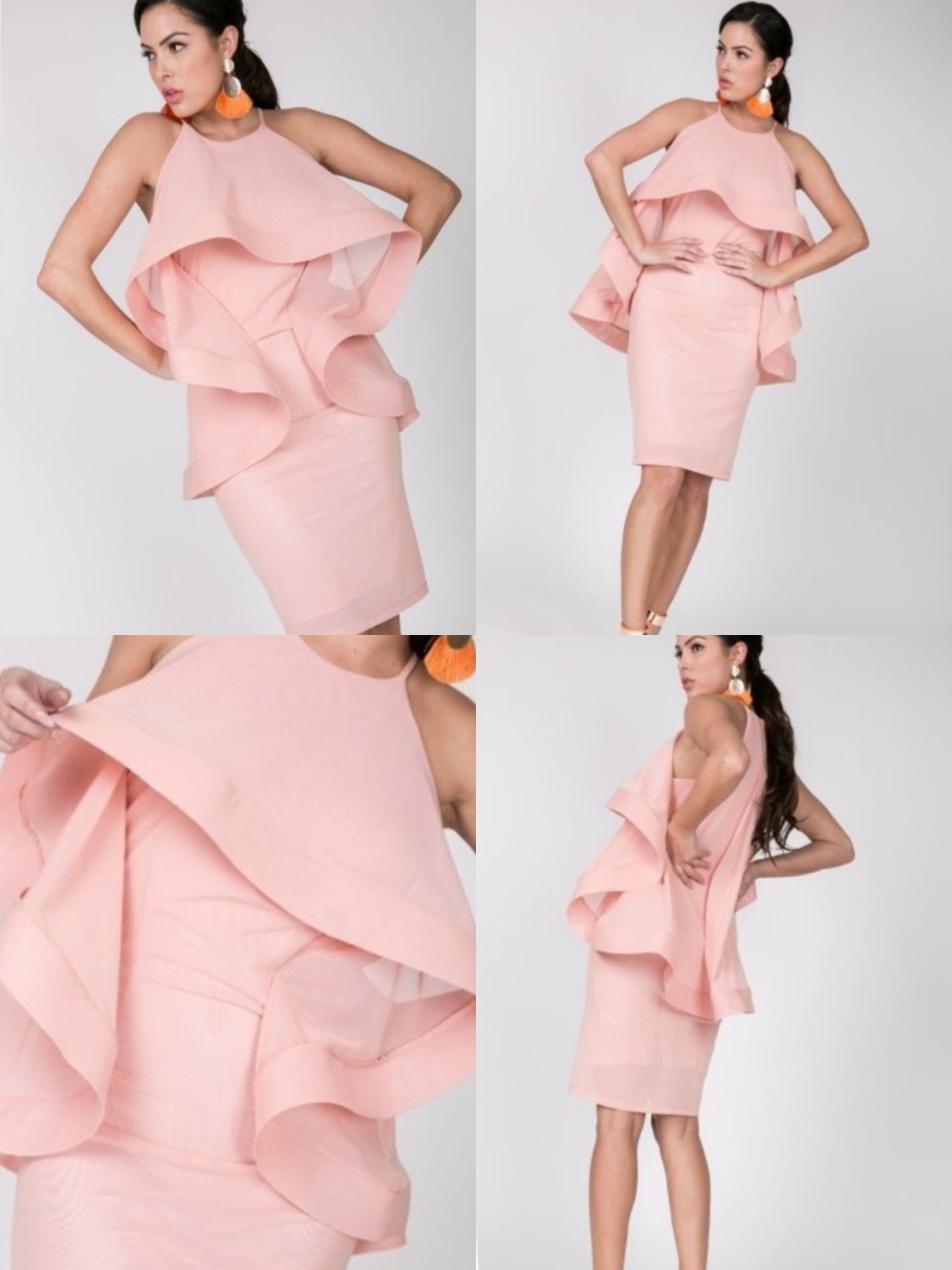 Fitted Dress Layered with a Thin Lining Sleeveless with Ruffled Detail 97% Polyester 3% Spandex Some Stretch , Fits Snug Due to Lining Color: Blush
