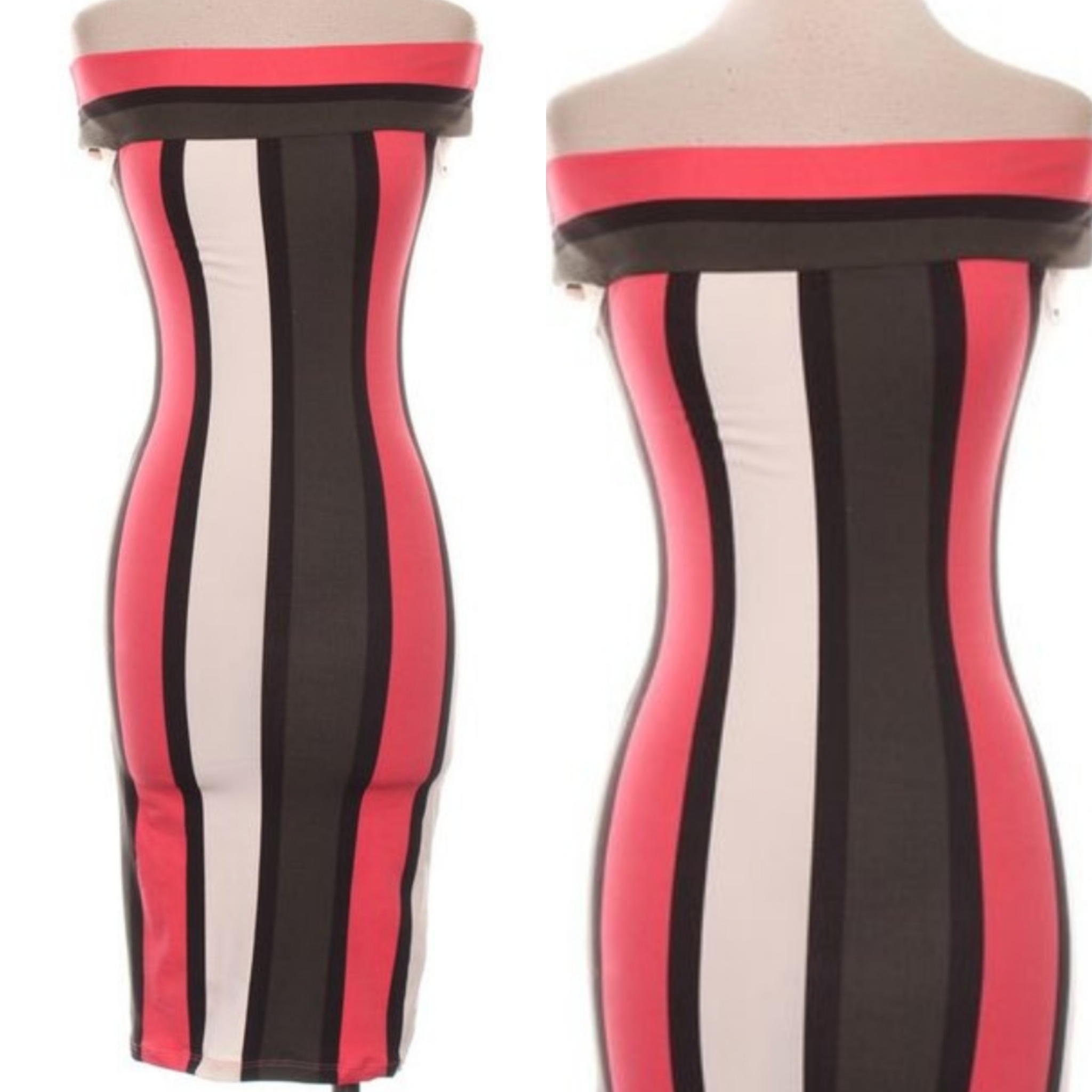 Coral/Multi Colored Off The Shoulder, Bold Stripe, Fitted Bodycon Dress. 92 % Polyester 8 % Spandex
