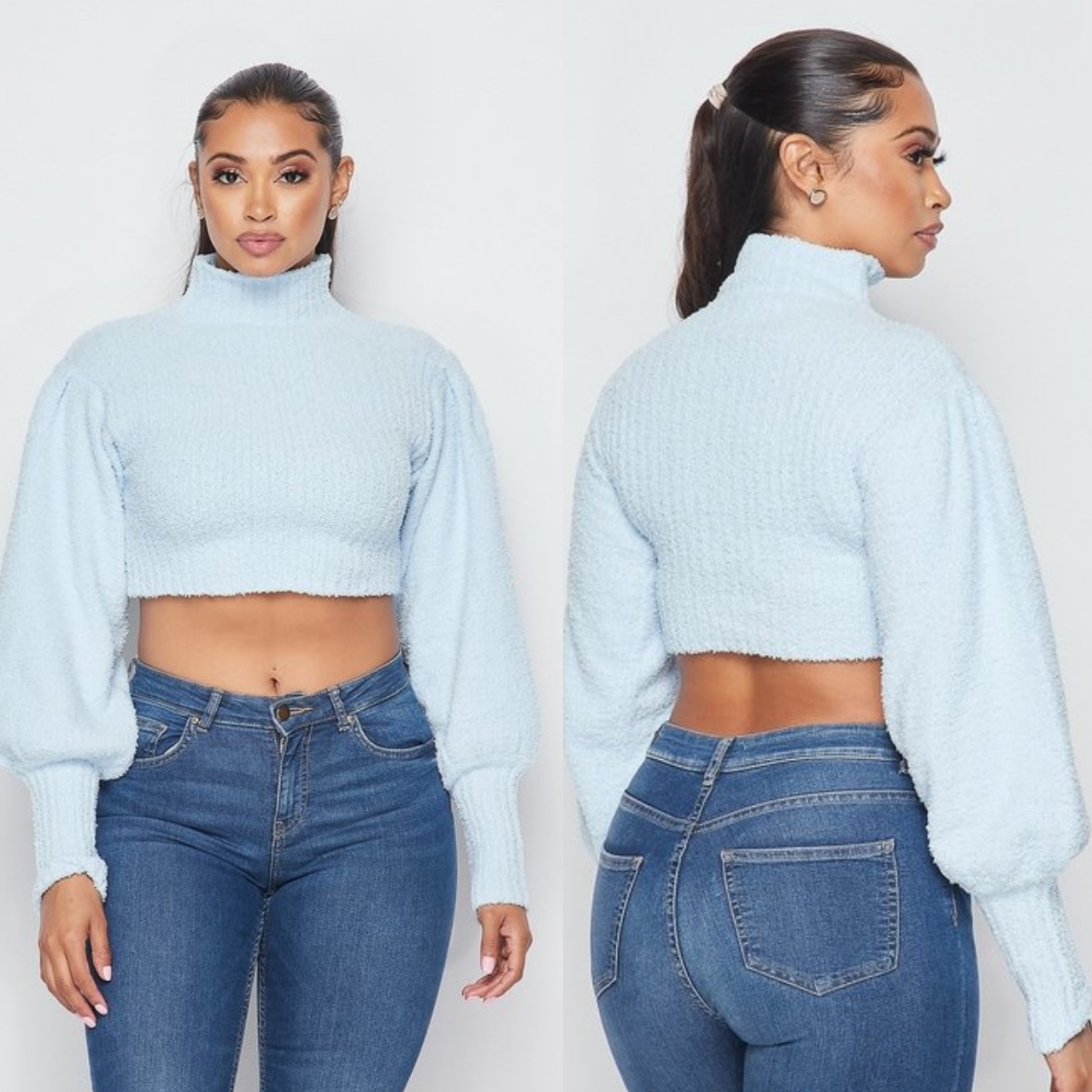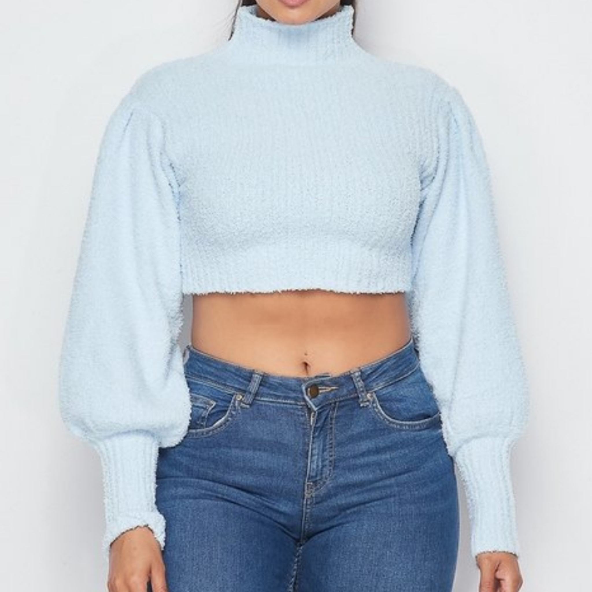 Baby Blue, Soft Knit Sweater Cropped style with mock neck and puffed sleeves. 100% Polyester